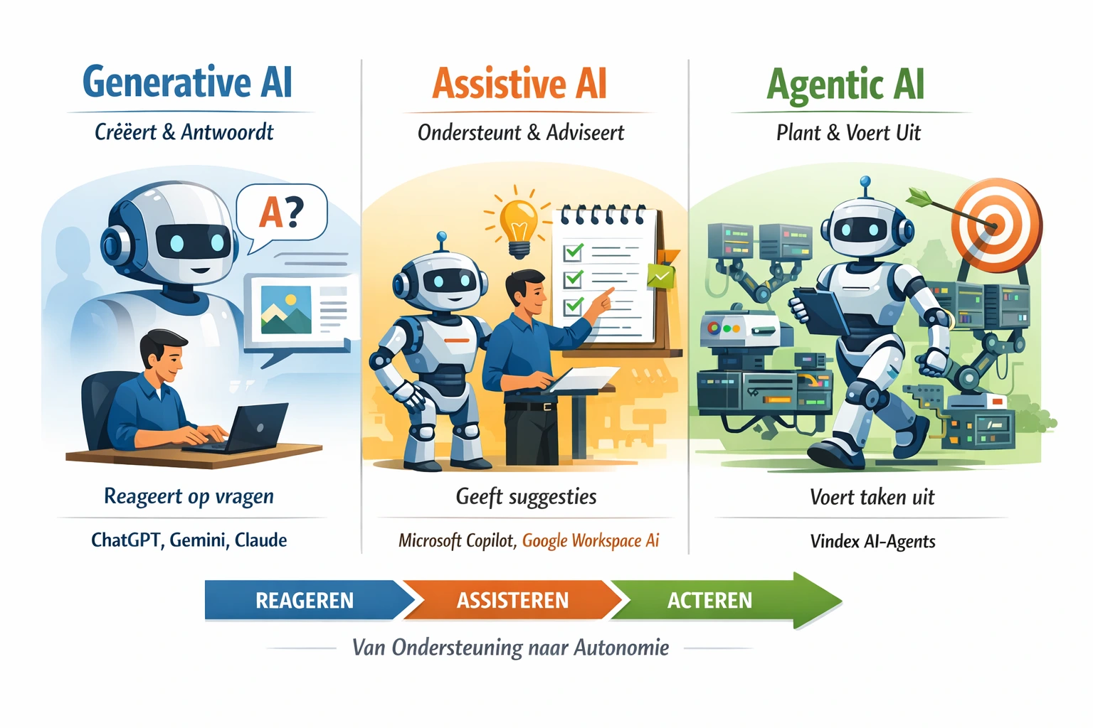 Agentic Ai markeert een fundamentele verschuiving in hoe organisaties automatisering inzetten. Waar traditionele generatieve Ai vooral antwoorden produceert, en assistive Ai (zoals Microsoft Copilot) gebruikers ondersteunt, gaat agentic Ai een niveau verder: het voert volledige taken en workflows autonoom uit — en met Vindex gebeurd dat binnen een gecontroleerde, veilige en transparante omgeving.