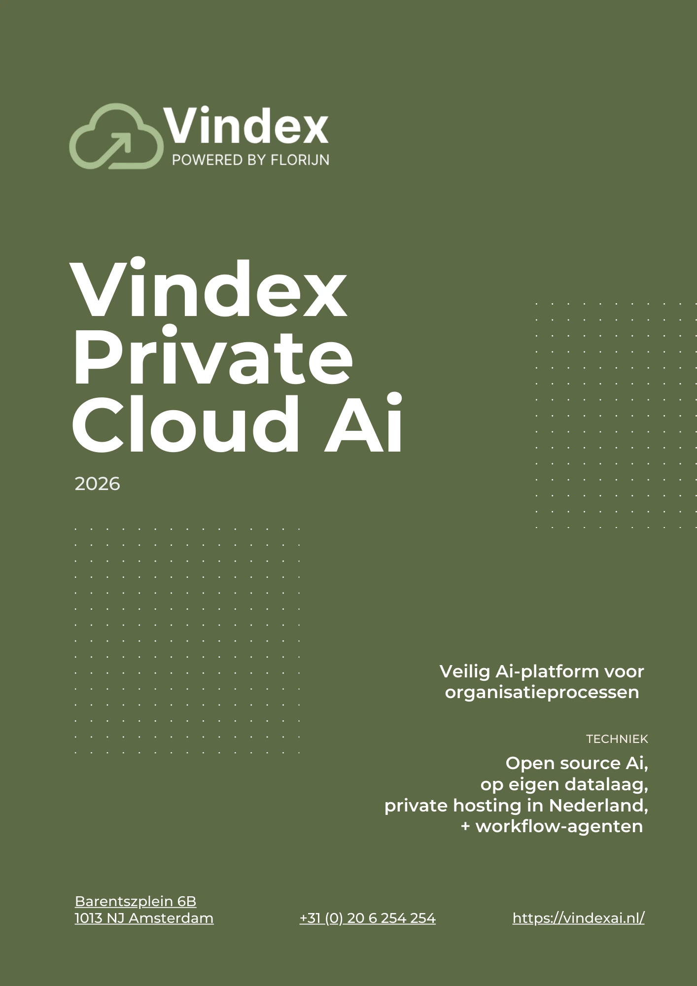 Wil je weten wat Vindex concreet oplevert? In deze commerciële bijlage ontdek je hoe ons Ai-platform minimaal 40 uur werk per week automatiseert. Ai volledig gebaseerd op jouw eigen data en gehost in een Nederlandse private cloud.