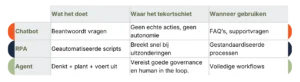 • In tegenstelling tot chatbots reageert een agent niet alleen. Hij plant, handelt, controleert, corrigeert en leert.